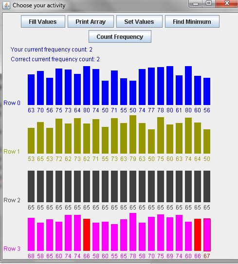 The two .java files (TwoDimArrayPrac.java and BarChart.java) running under the same project will animate your algorithm so that you can visually watch your code work. For this to happen, make sure that your single or nested for loops call the method animate. The arguments that you send to animate are not always the same and the location of the call to animate will differ depending on the task you are coding.